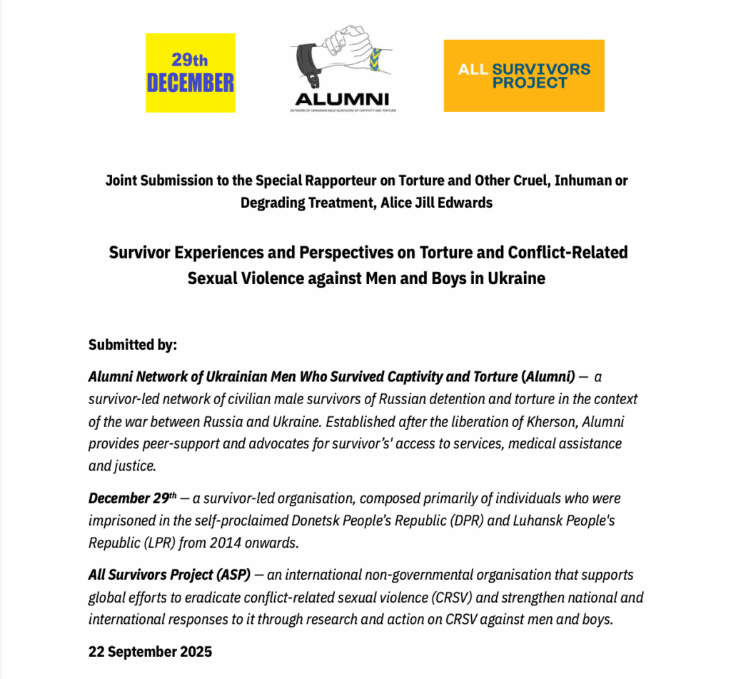 September 2025 | I/NGO, Letter, Submission, UN documents & other IGO Survivor Experiences and Perspectives on Torture and Conflict-Related Sexual Violence against Men and Boys in Ukraine