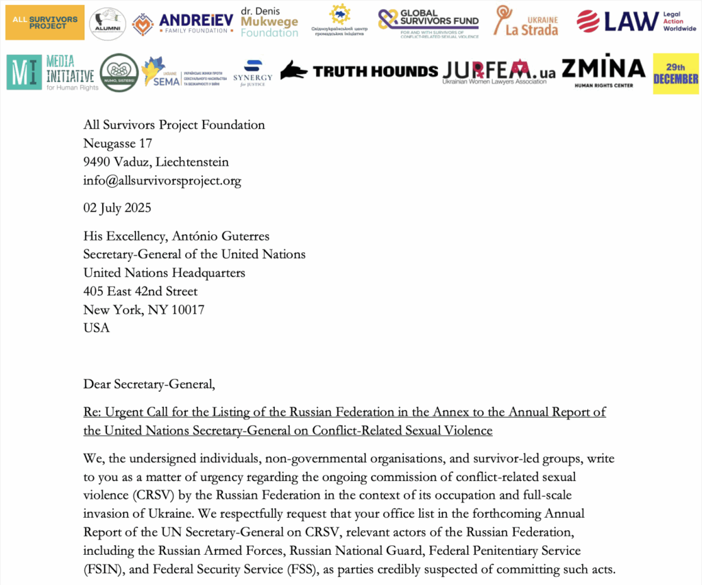 July 2025 | I/NGO, Letter, News release, Statement, UN documents & other IGO Urgent Call for the Listing of the Russian Federation in the Annex to the Annual Report of the United Nations Secretary-General on Conflict-Related Sexual Violence